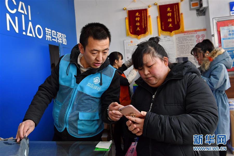 在山西省太原市富士康科技工業(yè)園的一家快遞驛站里,站長(zhǎng)張新(左)在查看顧客的快遞單號(hào)(1月15日攝)。