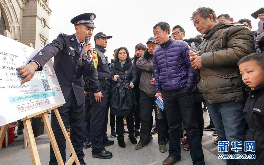 1月16日,民警講解真假火車票辨識方法。 當(dāng)日,武漢鐵路公安處在漢口火車站舉行警營開放日活動,讓旅客零距離接觸警務(wù)安全工作,營造良好的春運(yùn)出行環(huán)境。 新華社記者程敏攝