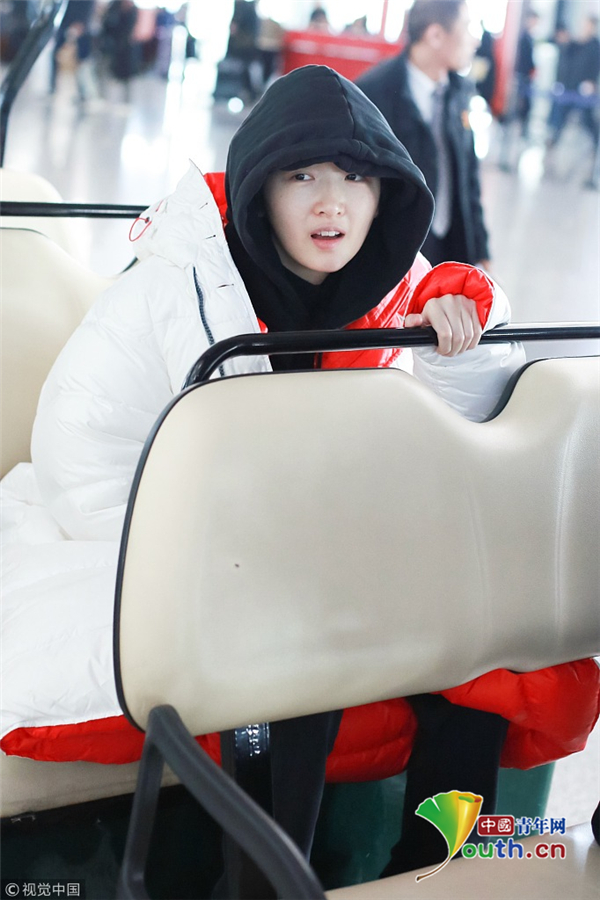 周冬雨連衣帽罩頭襯托小臉 下巴擱在行李車(chē)推桿呆萌可愛(ài)
