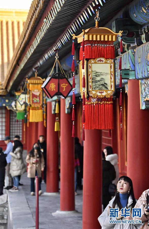 1月25日,游人在觀賞故宮內(nèi)懸掛的各式宮燈。 春節(jié)將至,北京故宮博物院內(nèi)張燈結(jié)彩,到處懸掛著宮燈、萬壽燈、年畫、門神、福字等古代宮廷節(jié)日裝飾品,讓來自國內(nèi)外的游人感受到濃濃的年味。 新華社記者 李欣攝
