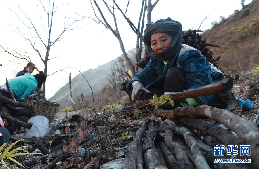 1月25日,在云南省蘭坪縣,余永妹在整理柴火。