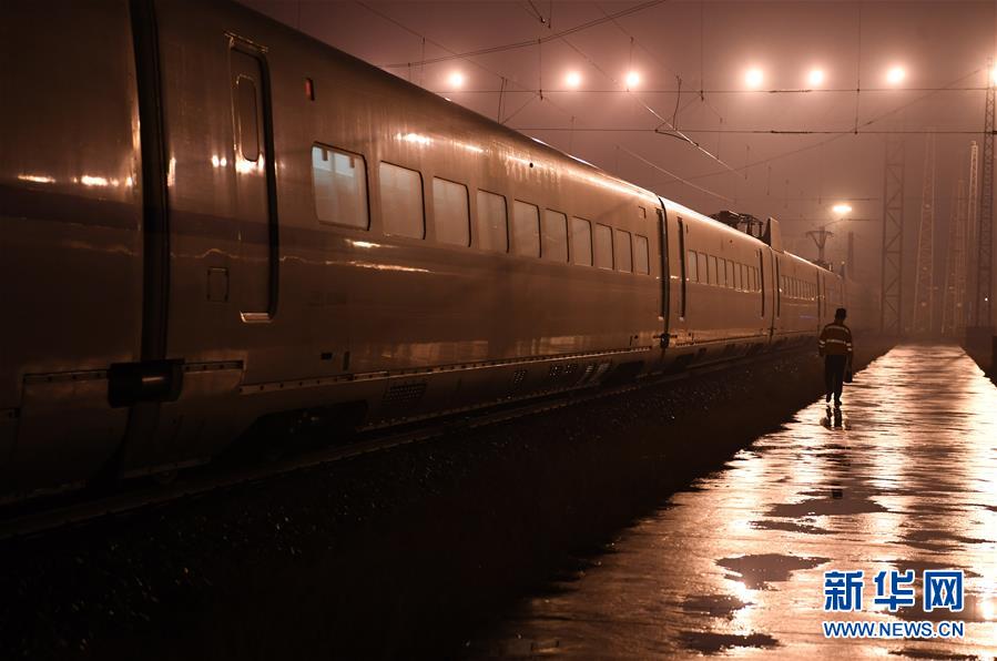 1月29日,王瑞在合肥南動車運用所存車場走向下一輛動車。新華社記者劉軍喜攝