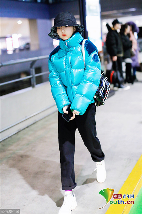 2019年1月31日,上海,張子楓現(xiàn)身機場。她身穿藍色羽絨服,戴著大檐帽也難擋好氣色,雪膚紅唇妝容精致展現(xiàn)女人味。