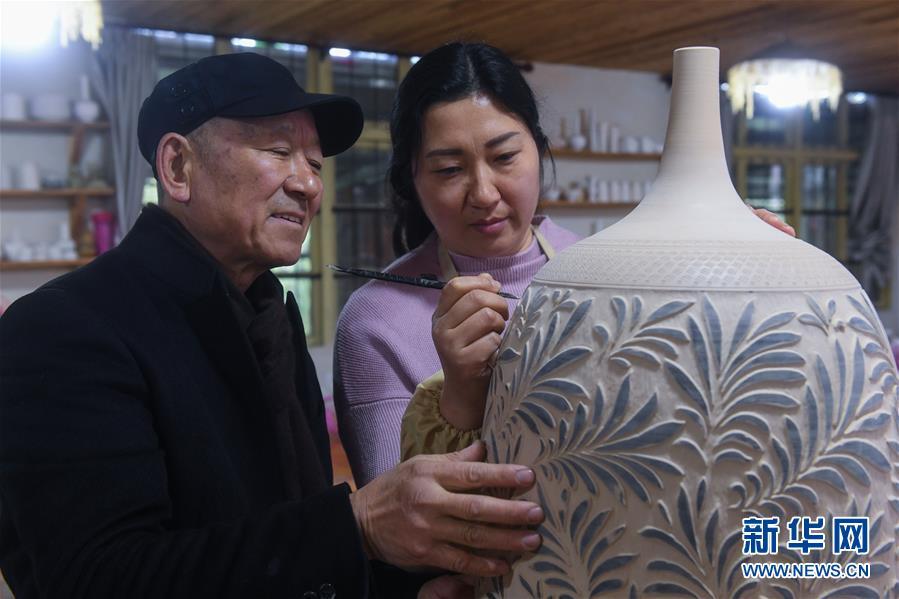 2月16日,陳新華(左)在指導(dǎo)徒弟進行刻花創(chuàng)作。新華社記者 徐昱 攝