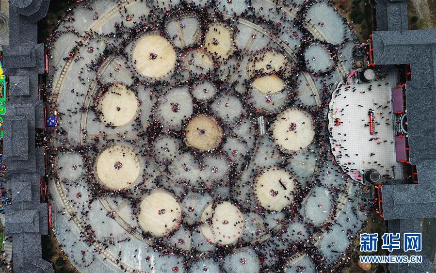 2月24日,在貴州省凱里市舟溪鎮(zhèn),苗族群眾在跳蘆笙舞(無人機(jī)拍攝)。 當(dāng)日,在貴州省黔東南苗族侗族自治州凱里市舟溪鎮(zhèn),來自各地的苗族群眾身著節(jié)日盛裝,歡聚在古老的“甘囊香”蘆笙堂,男子吹奏起蘆笙,姑娘和孩子們跳起蘆笙舞,歡度新春,祈求風(fēng)調(diào)雨順、五谷豐登,青年男女也借此良日尋覓意中人。 “甘囊香”是苗語音譯,意思為“河流的下游,神仙匯聚的地方”。“甘囊香”蘆笙會是貴州規(guī)模最大、最古樸的苗族蘆笙會之一。 新華社記者楊文斌攝