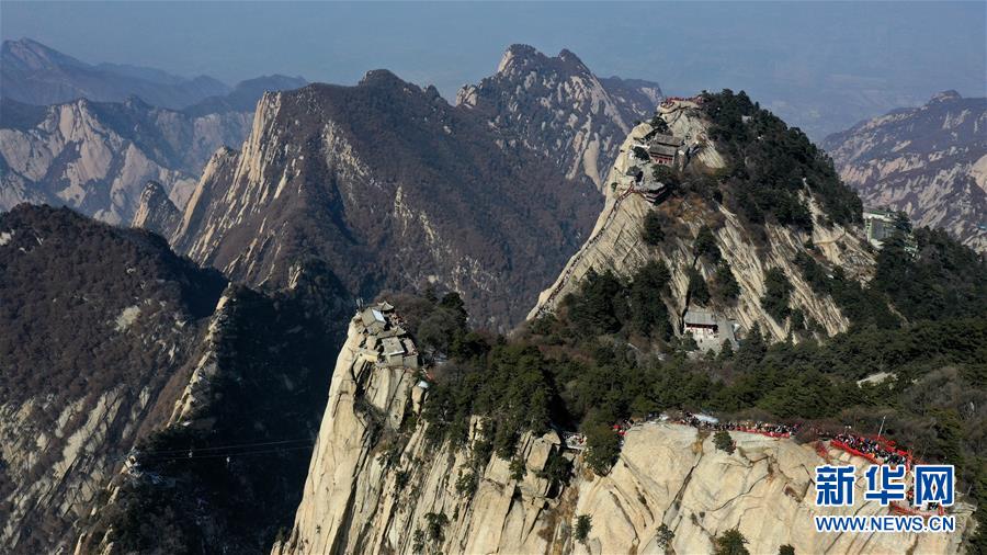 3月9日,游人在華山南峰游覽(無(wú)人機(jī)拍攝)。 隨著氣溫回升,陜西著名風(fēng)景區(qū)華山進(jìn)入旅游旺季。 新華社記者 陶明 攝