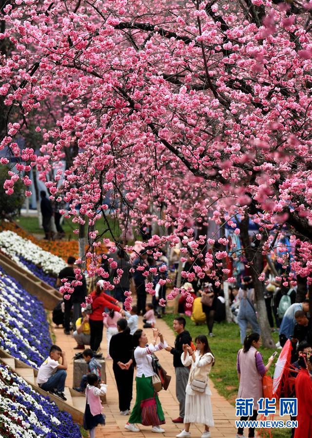 游人在昆明圓通山公園觀賞盛開的櫻花(3月16日攝)。近日,云南省昆明市迎來櫻花盛開的時節(jié)。昆明圓通山公園的數(shù)千株櫻花燦爛綻放,吸引了市民和游客前來觀花賞景。新華社記者藺以光攝