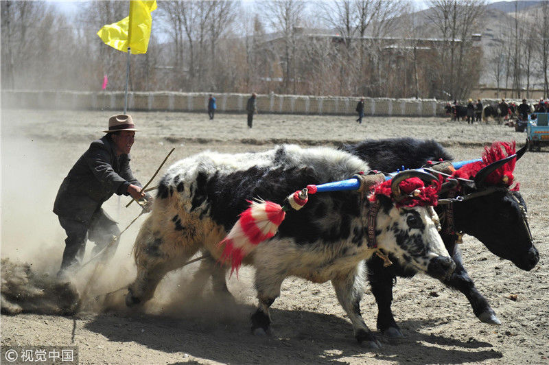 圖為白朗縣洛江鎮(zhèn)農(nóng)牧民進行“賽?!被顒樱灰r(nóng)牧民不從犁上掉下來,便可以獲得一把象征著勞動致富的鐵鍬。