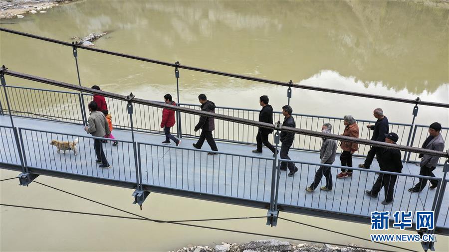 3月25日,略陽(yáng)縣徐家坪鎮(zhèn)藥木院村村民走在新修的鋼結(jié)構(gòu)吊橋上。 新華社記者陶明攝