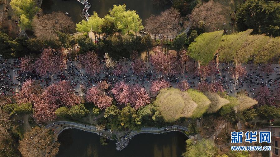 3月31日,游客在中國(guó)科學(xué)技術(shù)大學(xué)東區(qū)觀賞櫻花(無(wú)人機(jī)拍攝)。