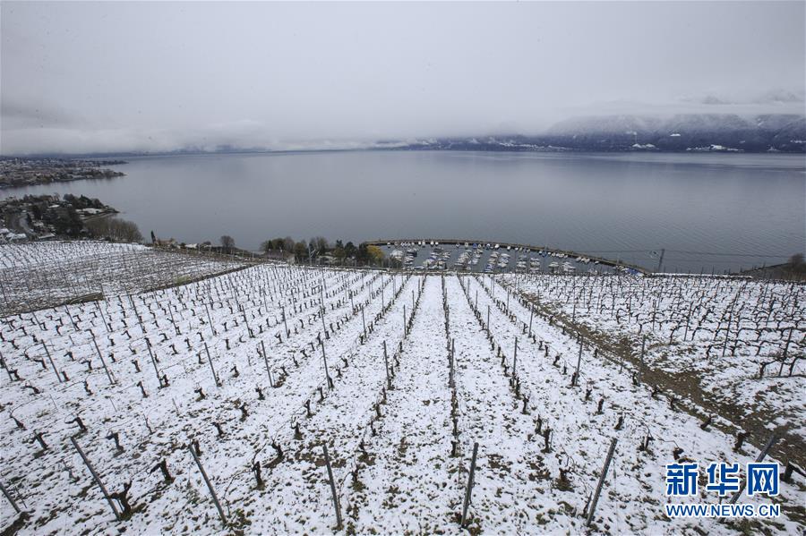 這是4月4日在瑞士西部拉沃地區(qū)拍攝的雪后梯田式葡萄園美景。