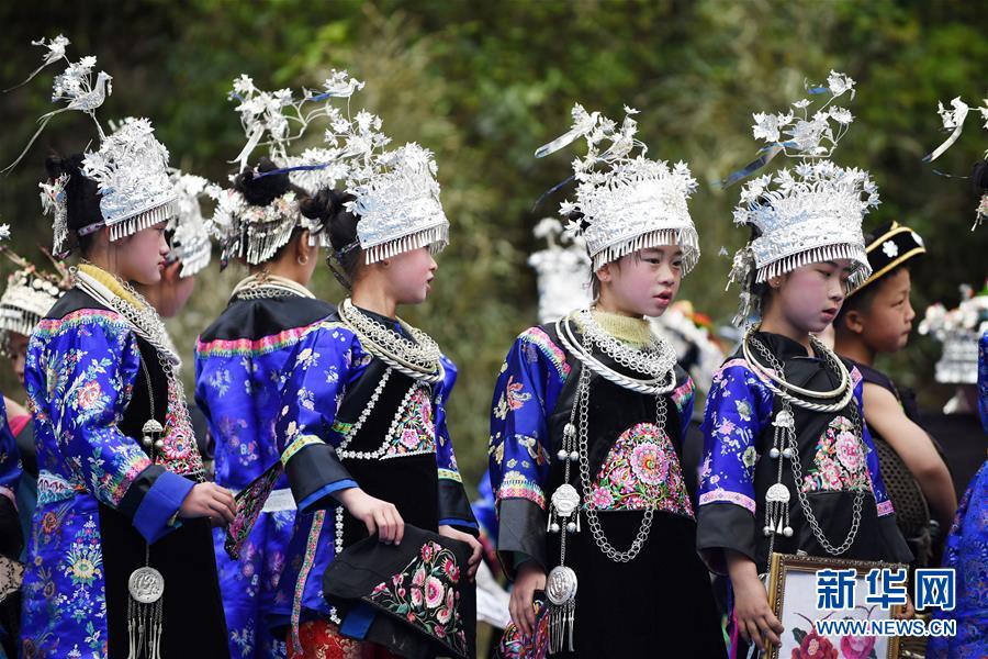 幾名苗族女孩在參加非遺手工藝展演活動(4月6日攝)。4月6日至7日,在貴州省黔東南苗族侗族自治州劍河縣觀么鎮(zhèn)新民村和新合村,來自劍河縣和三穗縣的苗族同胞歡聚一堂,通過民族歌舞展演、非遺手工藝展示、千戶祭“巫耶”、跳蘆笙舞等形式,與來賓一起歡慶2019年高雍苗族“三月三”民俗文化節(jié)。 新華社記者 楊文斌 攝