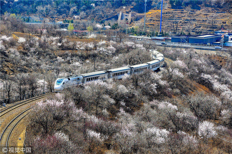 2019年3月22日,北京居庸關(guān)附近的山花盛開(kāi),S2線列車穿行在花海之中,構(gòu)成一幅美麗的畫面。