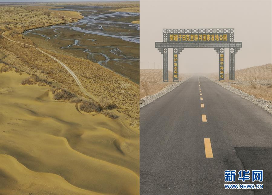 拼版照片:左圖為沿著克里雅河通向地處沙漠深處新疆于田縣達(dá)里雅布依鄉(xiāng)的路(3月19日無人機(jī)拍攝);右圖為從縣城通往達(dá)里雅布依小鎮(zhèn)易地扶貧安置點(diǎn)的柏油路(3月20日攝)。新華社記者 胡虎虎 攝