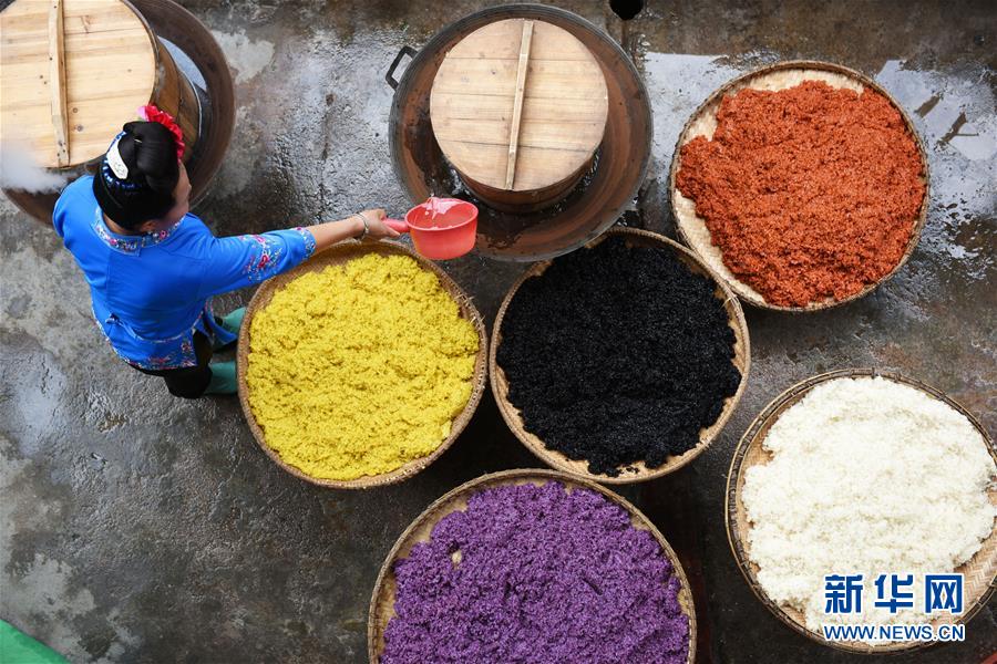 4月17日,在貴州省臺(tái)江縣姊妹街哆蝶五彩姊妹飯?bào)w驗(yàn)店,苗家婦女在蒸煮五彩“姊妹飯”。新華社記者 楊文斌 攝
