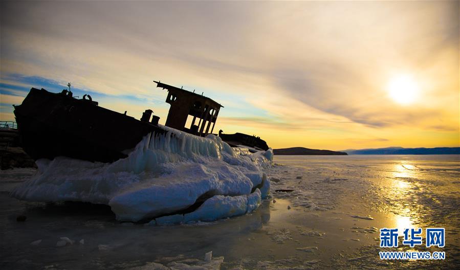 這是2017年3月28日在俄羅斯貝加爾湖奧利洪島上拍攝的日落時(shí)分的廢船。 新華社記者張帆攝