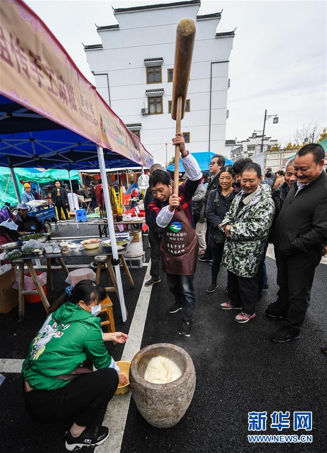 11月19日,商戶在廟會(huì)現(xiàn)場(chǎng)展示傳統(tǒng)打年糕。 新華社記者 徐昱 攝