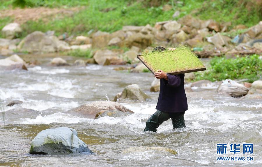 在黔桂烏英苗寨,村民扛著秧苗過(guò)河,準(zhǔn)備插秧(4月16日攝)。 新華社記者 黃孝邦 攝