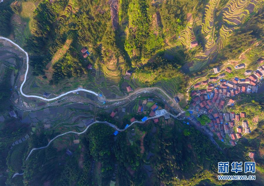 這是春耕時(shí)節(jié)的黔桂烏英苗寨梯田(4月16日無(wú)人機(jī)拍攝)。 新華社記者 黃孝邦 攝