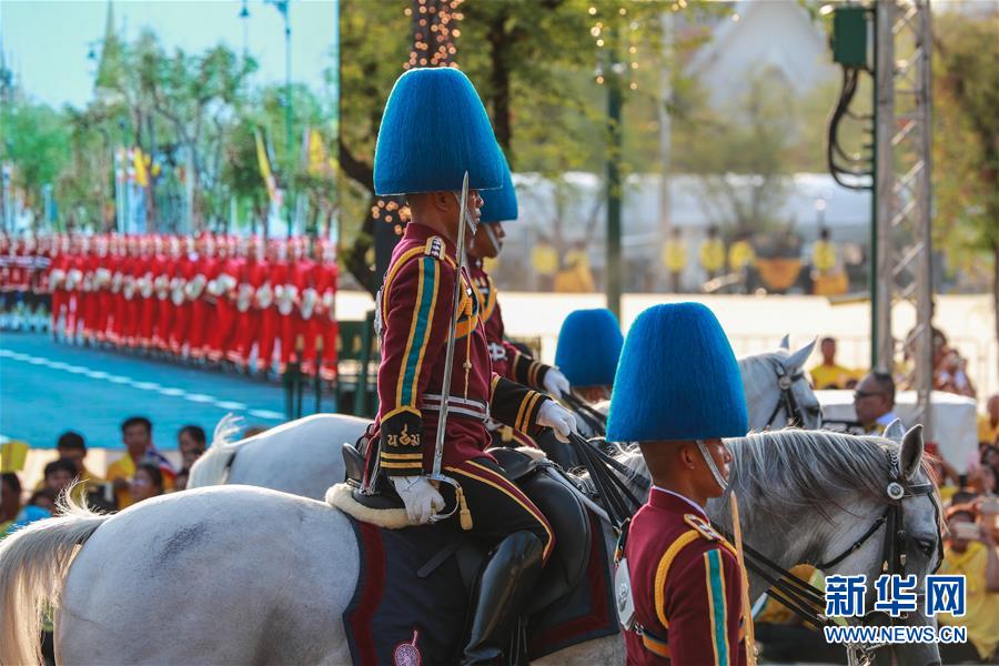 5月5日,儀仗隊在曼谷大王宮附近舉行的泰國國王加冕典禮巡游上列隊前進。 新華社記者 張可任 攝