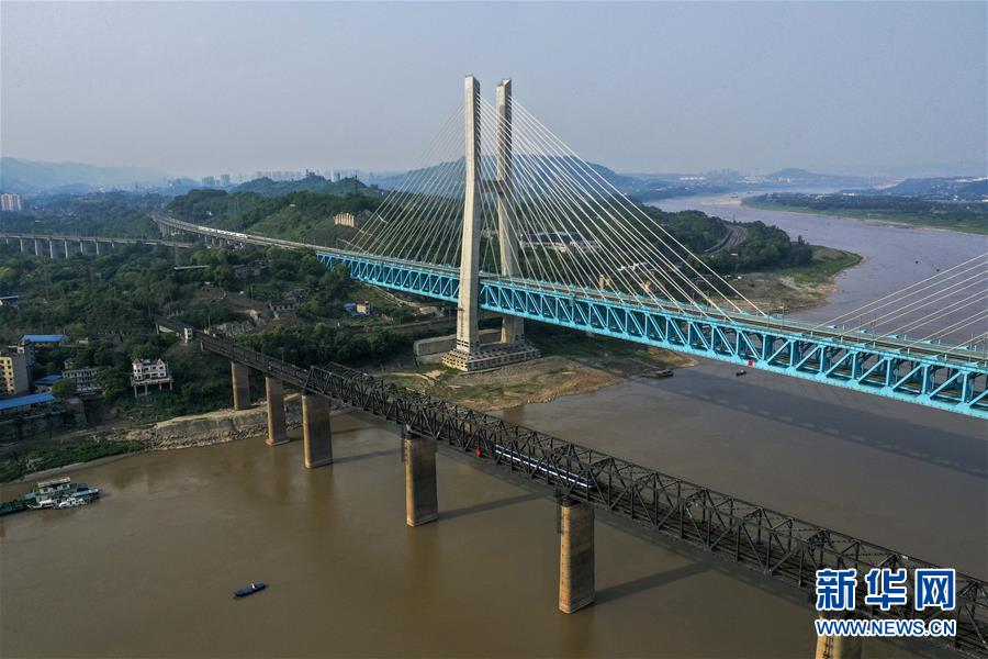 重慶白沙沱長江大橋(下)和新白沙沱長江特大橋(上)(4月23日無人機(jī)拍攝)。 4月23日下午5點40分,隨著重慶白沙沱長江大橋通行的最后一列客運列車順利通過,這座“服役”了59年的重慶首座長江大橋進(jìn)入“退役”倒計時。4月24日后,所有列車將改線經(jīng)距白沙沱長江大橋約100米的新白沙沱長江特大橋通行,新橋“接力”老橋,運輸能力將得到大幅提升。 白沙沱長江大橋于1958年開工,1960年通過首趟列車,是繼武漢長江大橋之后的第二座長江大橋。 新華社記者 劉潺 攝