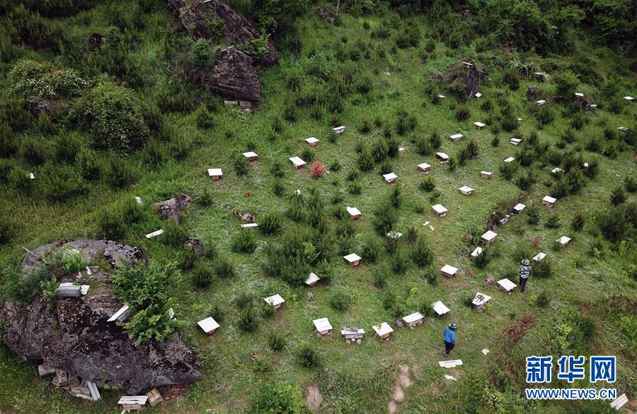 5月10日,在甘肅省隴南市徽縣大河店鎮(zhèn)硬灣村,蜂農(nóng)查看蜂箱情況(無人機(jī)拍攝)。 甘肅省隴南市徽縣大河店鎮(zhèn)硬灣村位于秦巴山區(qū)深處,2017年,在當(dāng)?shù)卣姆龀窒拢堁吕铣裁垧B(yǎng)殖農(nóng)民專業(yè)合作社成立,蜂農(nóng)們將傳統(tǒng)養(yǎng)蜂技藝和現(xiàn)代加工方式相結(jié)合,并通過電商等渠道打開銷路,有效帶動(dòng)了當(dāng)?shù)刎毨Т迕衩撠氈赂?。目前整個(gè)合作社共有蜂箱2000余個(gè),每箱每年可帶來三四千元的收入。 新華社記者 馬寧 攝