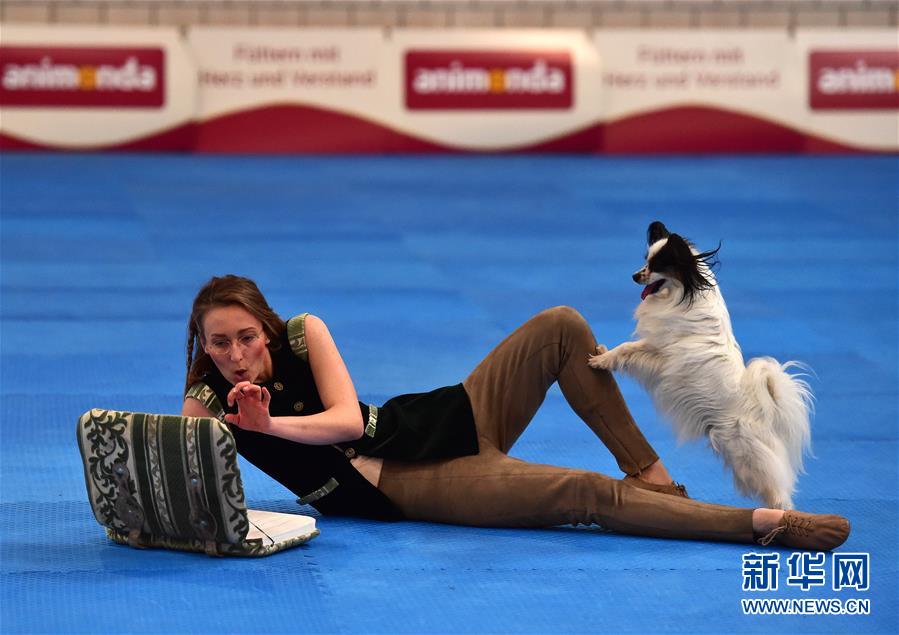 5月19日,在德國多特蒙德舉行的寵物展上,一名女士帶著愛犬參加寵物跳舞比賽。 為期三天的德國多特蒙德“狗和貓”寵物展19日落幕。寵物展期間,人們帶著自己的“萌寵”來到會(huì)場,參與寵物跳水、舞蹈、選美等趣味比賽,并與其他寵物愛好者及展商交流互動(dòng)。 新華社記者逯陽攝