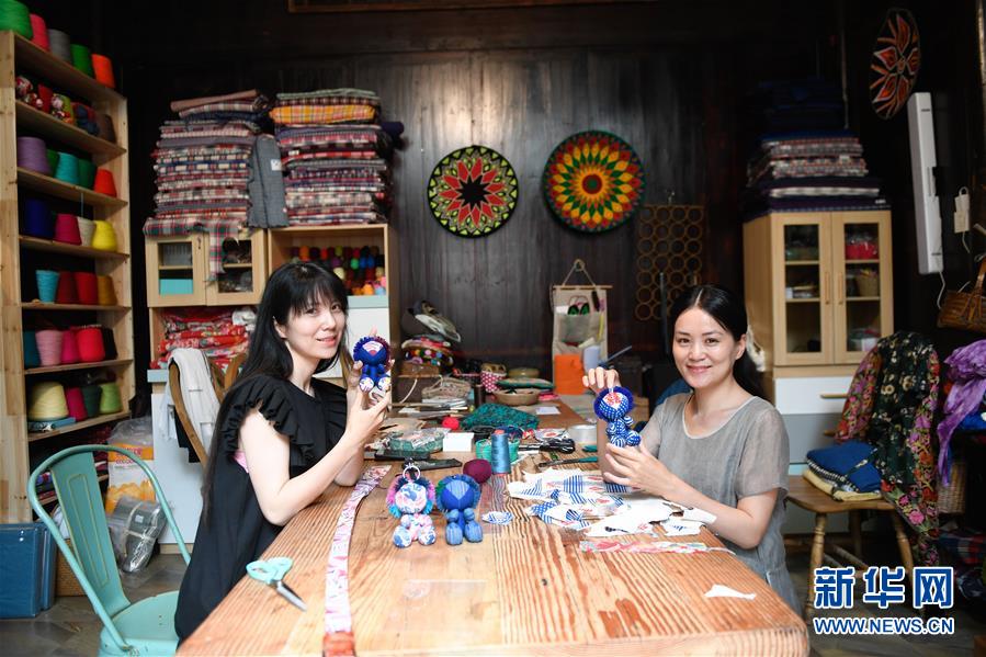 5月26日,在石舍村共同經(jīng)營“三只蝸?!笔止に嚻飞痰旰涂蜅5慕忝藐愖袭嫞ㄓ遥?、陳莫寒在展示制作的手工藝品。 石舍村是浙江省桐廬縣富春江鄉(xiāng)村慢生活體驗區(qū)中的三個村落之一,位置偏僻,依溪而居,風(fēng)景秀美。近年來,石舍村結(jié)合古建筑保護工作,在清潔、美化村莊的基礎(chǔ)上,對一些廢棄古建筑進(jìn)行修繕,引入咖啡館、民宿等文化創(chuàng)意類項目,優(yōu)良的生態(tài)環(huán)境和濃郁的文化氛圍吸引大批游客前來體驗,小山村走上了一條發(fā)展美麗經(jīng)濟之路。2018年,石舍村接待游客10萬8千余人次,旅游經(jīng)營凈收入1260余萬元。 新華社記者 黃宗治 攝