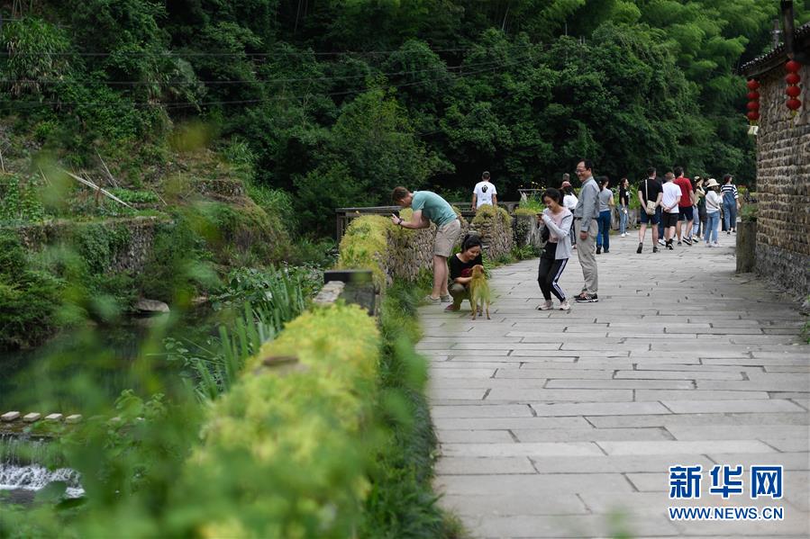 游客在石舍村游覽(5月25日攝)。 石舍村是浙江省桐廬縣富春江鄉(xiāng)村慢生活體驗區(qū)中的三個村落之一,位置偏僻,依溪而居,風景秀美。近年來,石舍村結合古建筑保護工作,在清潔、美化村莊的基礎上,對一些廢棄古建筑進行修繕,引入咖啡館、民宿等文化創(chuàng)意類項目,優(yōu)良的生態(tài)環(huán)境和濃郁的文化氛圍吸引大批游客前來體驗,小山村走上了一條發(fā)展美麗經濟之路。2018年,石舍村接待游客10萬8千余人次,旅游經營凈收入1260余萬元。 新華社記者 黃宗治 攝