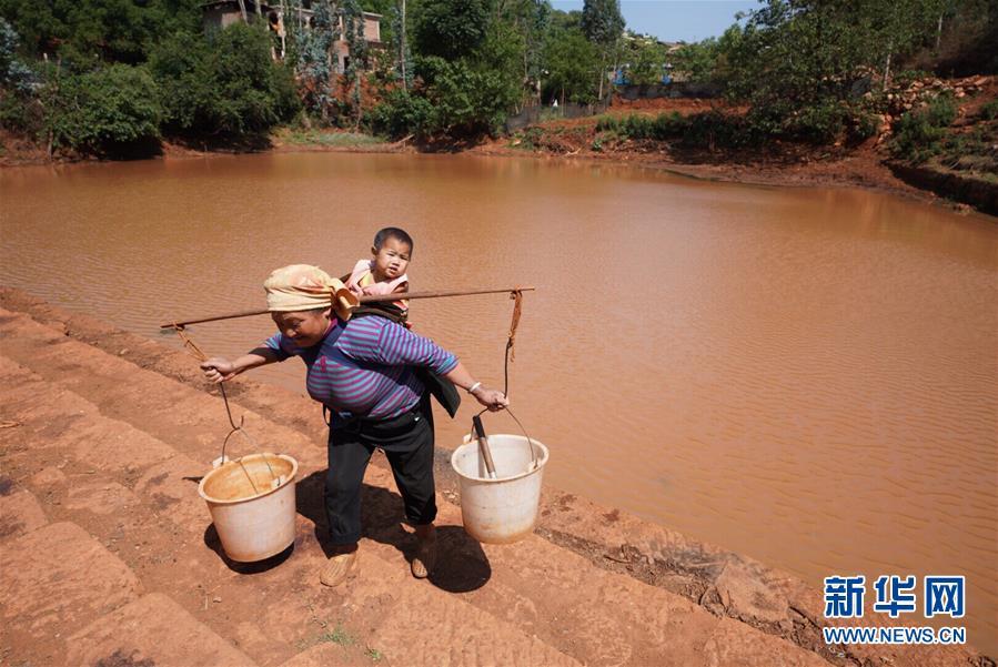 5月17日,巡檢司鎮(zhèn)烏稠村村民楊永珍從附近的壩塘挑水。 云南省紅河哈尼族彝族自治州彌勒市大部分地區(qū)氣象干旱等級近期已達(dá)中旱,其中山區(qū)和半山區(qū)達(dá)到重旱,18.8萬畝農(nóng)作物受旱,2700余人、960多頭牲畜飲水困難。當(dāng)?shù)匾呀M織4.2萬人、1萬臺車輛投入抗旱工作。 新華社記者 秦晴 攝