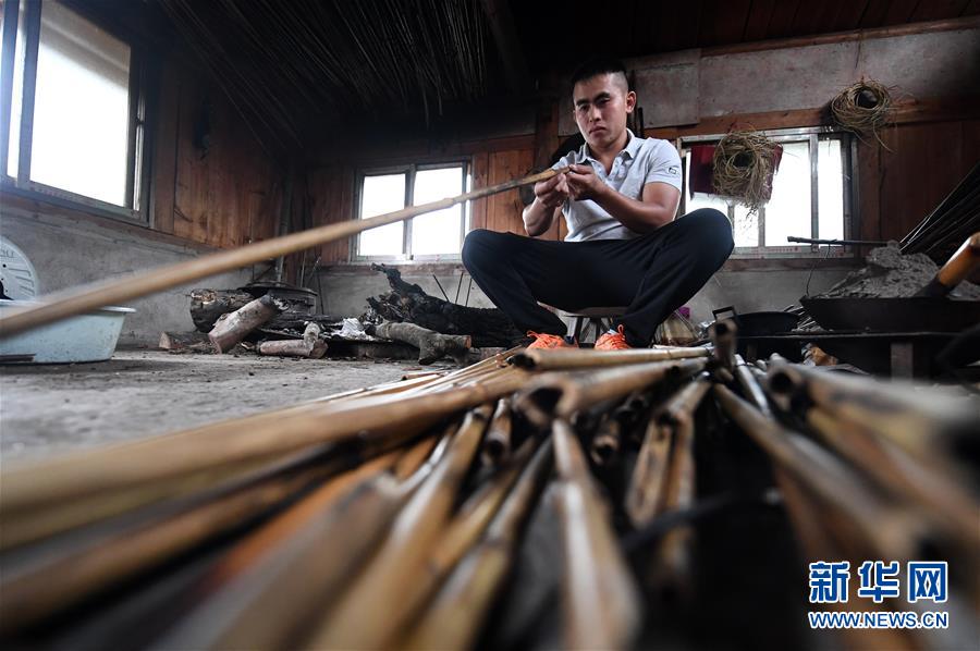 5月30日,在融水苗族自治縣安太鄉(xiāng)小桑村青山屯,杜信文在挑選熏干的竹子準(zhǔn)備做蘆笙。 新華社記者 陸波岸 攝