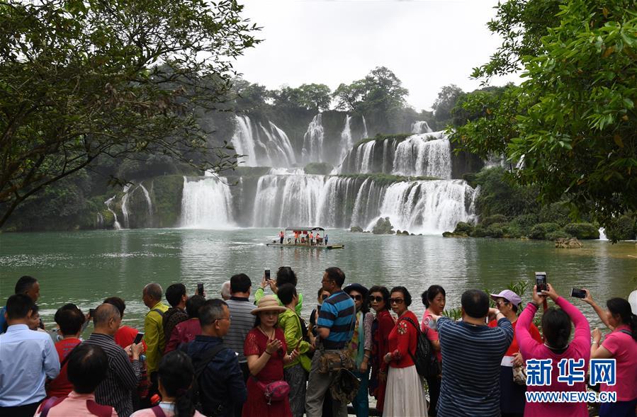 近日,隨著降雨增多,位于中越邊境的廣西大新縣德天瀑布水量增大,吸引大批游客前來(lái)觀光游覽。