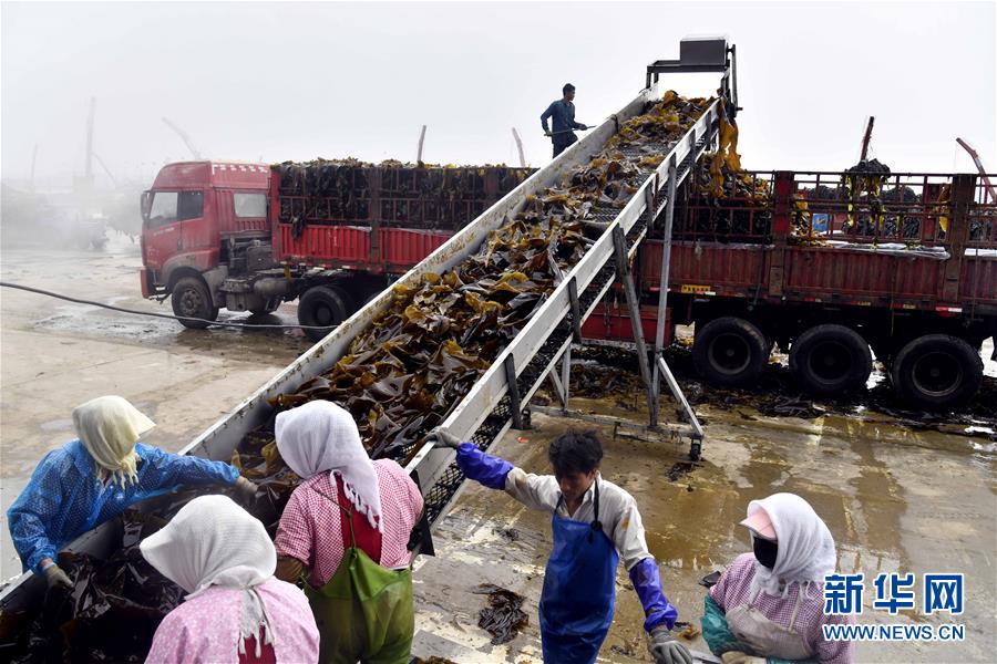 6月5日,在榮成市尋山街道青魚(yú)灘村,漁民在收獲海帶。 近日,山東省榮成市迎來(lái)海帶收獲季。據(jù)悉,榮成市海帶養(yǎng)殖面積14.5萬(wàn)畝,年產(chǎn)海帶43.3萬(wàn)噸以上。 新華社記者郭緒雷攝
