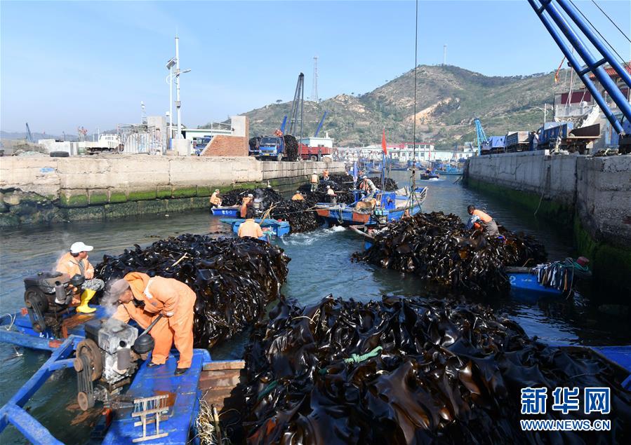 大欽島鄉(xiāng)東村碼頭擠滿了正在卸載的收割船(5月24日攝)。新華社記者 朱崢 攝