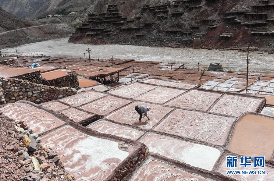 西藏芒康縣納西民族鄉(xiāng)加達(dá)村村民在鹽田曬鹽(6月4日攝)。新華社記者晉美多吉攝
