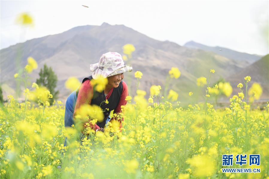 7月2日,拉薩市堆龍德慶區(qū)朗巴鄉(xiāng)村民玉珍在打理油菜花田。 近日,西藏各地的油菜花盛開,呈現(xiàn)出生機(jī)勃勃的夏日美景。 新華社記者 晉美多吉 攝