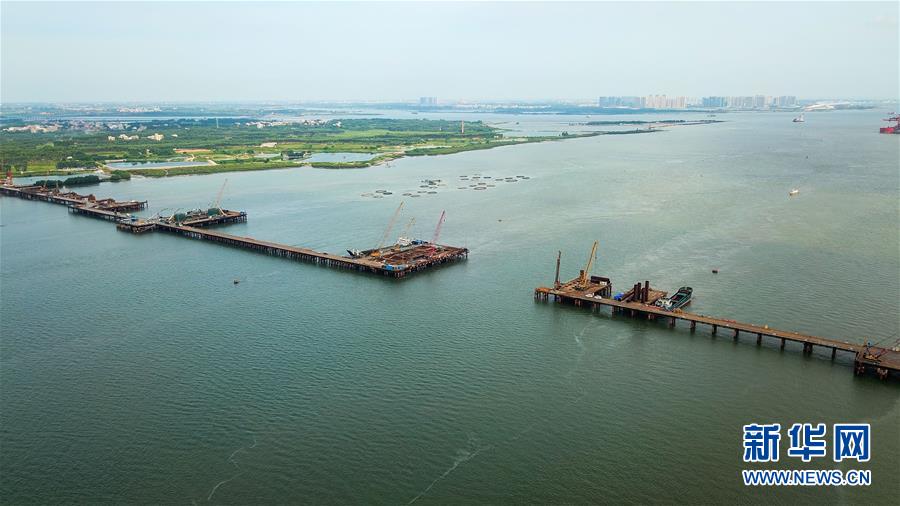 這是7月6日無(wú)人機(jī)拍攝的湛江調(diào)順跨海大橋東岸主塔墩承臺(tái)建設(shè)現(xiàn)場(chǎng)。 新華社記者 劉大偉 攝