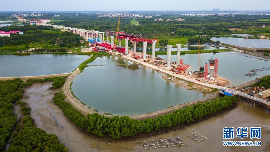 這是7月6日無(wú)人機(jī)拍攝的湛江調(diào)順跨海大橋東岸移動(dòng)模架施工現(xiàn)場(chǎng)。 新華社記者 劉大偉 攝