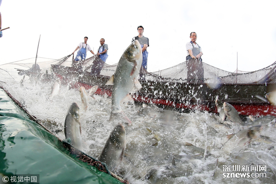 2018年6月26日,江蘇省常州市嘉澤鎮(zhèn)捕撈村的漁民組織夏季捕撈,一網(wǎng)魚達五萬余斤,以鰱魚為主,供應(yīng)市場需求。夏捕的魚價較平時有所上漲,漁民粗略估計可增收上萬余元。