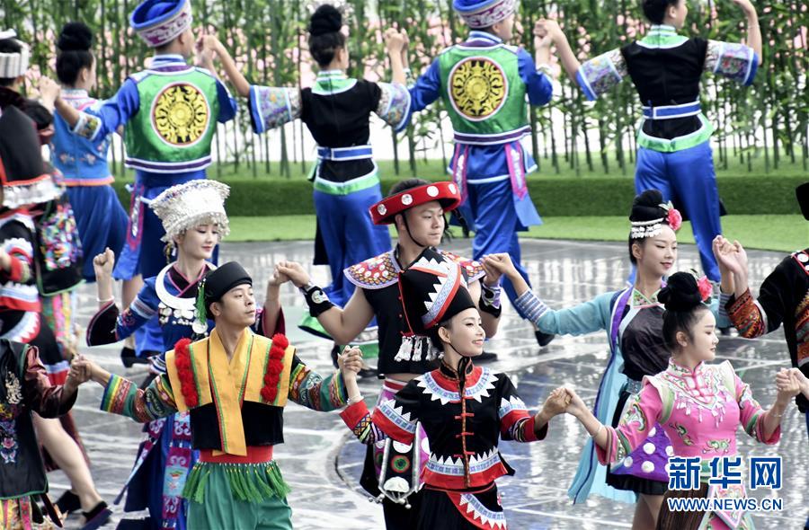 8月4日,來(lái)自貴州省黔東南苗族侗族自治州的演員在表演民族歌舞。新華社記者 李欣 攝