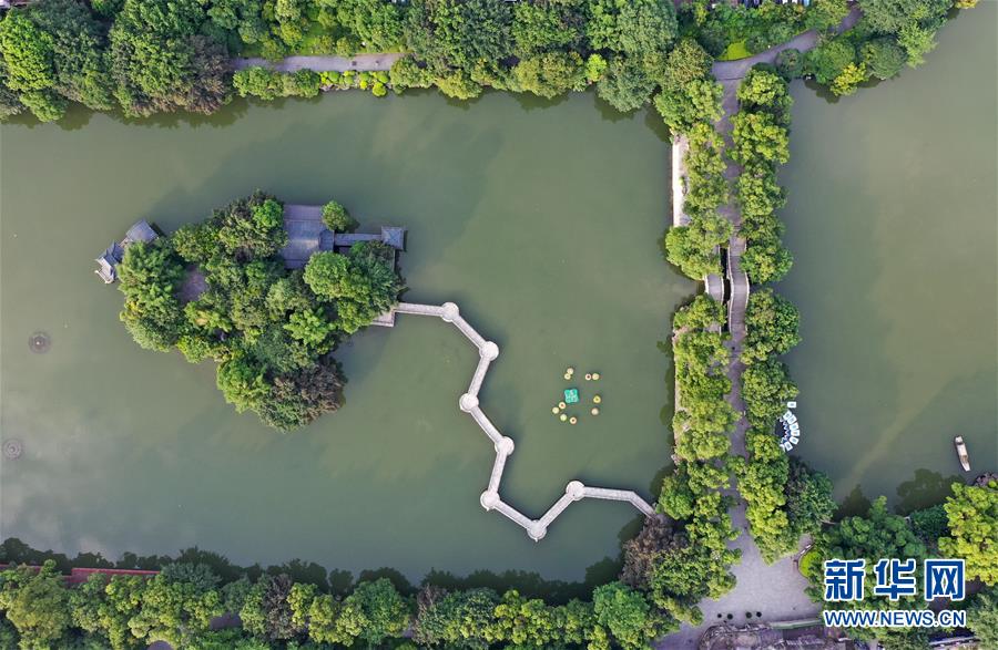 桂林市榕湖上的橋梁(7月1日無(wú)人機(jī)拍攝)。 夏日時(shí)節(jié),廣西桂林市區(qū)內(nèi)的榕湖、杉湖、桂湖、木龍湖等地綠樹(shù)成蔭、景色迷人。 新華社記者陸波岸攝