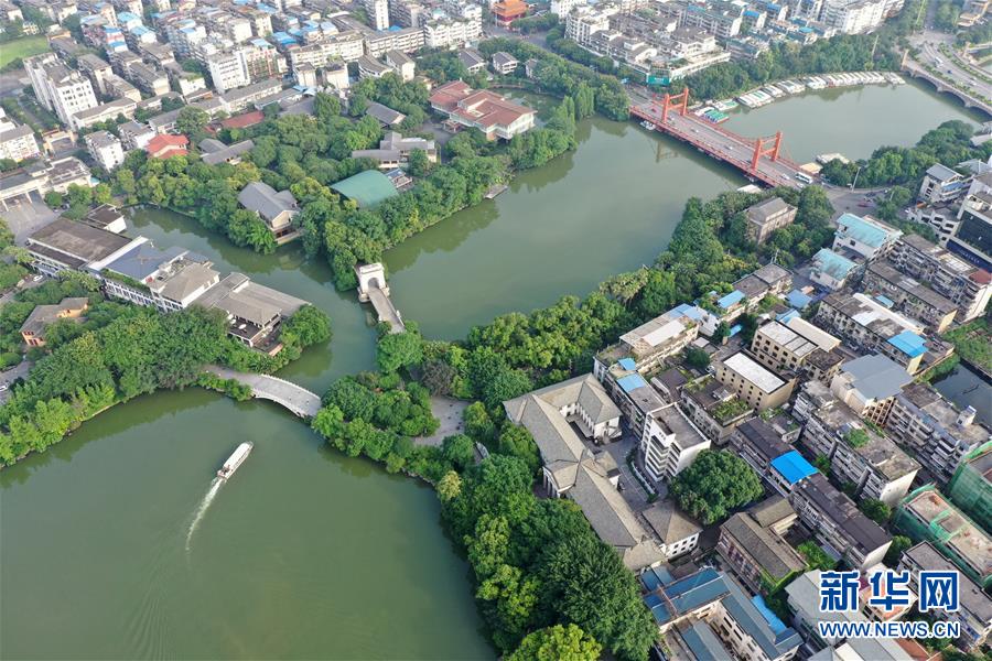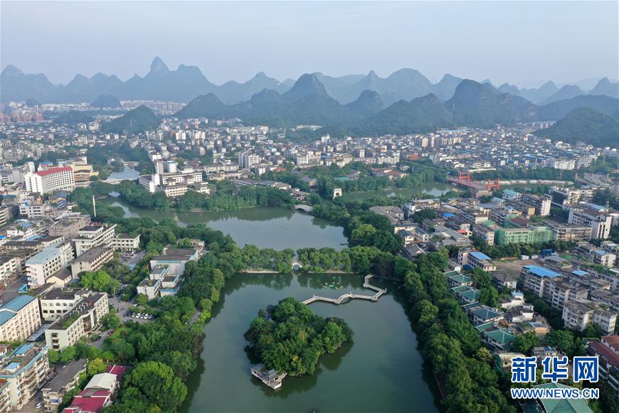 桂林市榕湖附近景觀(7月1日無(wú)人機(jī)拍攝)。 夏日時(shí)節(jié),廣西桂林市區(qū)內(nèi)的榕湖、杉湖、桂湖、木龍湖等地綠樹(shù)成蔭、景色迷人。 新華社記者陸波岸攝