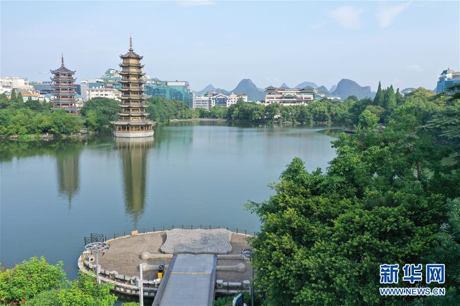 桂林市杉湖景觀(7月1日無(wú)人機(jī)拍攝)。 夏日時(shí)節(jié),廣西桂林市區(qū)內(nèi)的榕湖、杉湖、桂湖、木龍湖等地綠樹(shù)成蔭、景色迷人。 新華社記者陸波岸攝