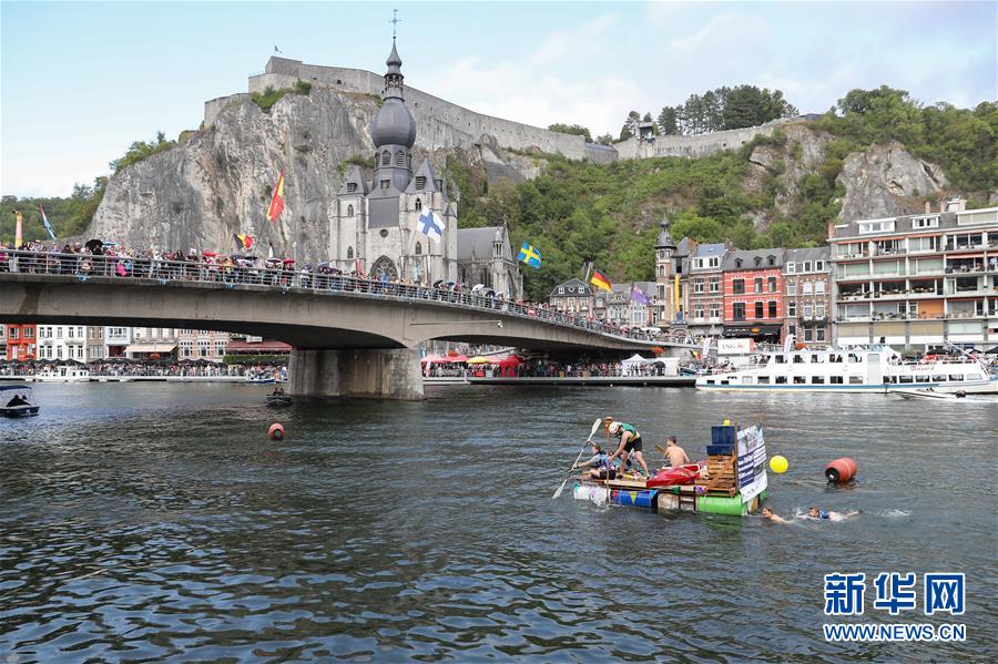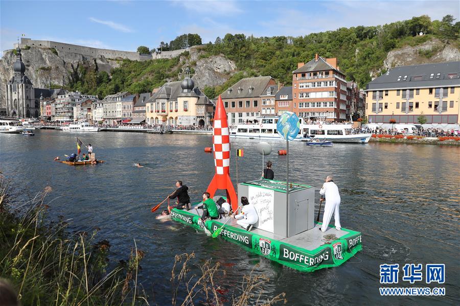 8月15日,在比利時南部小城迪南的默茲河上,人們參加“浴缸劃船節(jié)”的表演。