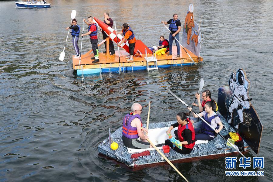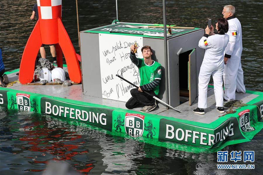 當日,一年一度的水上狂歡活動“浴缸劃船節(jié)”在比利時迪南舉行。該活動要求參賽者制造的船上至少帶有一個浴缸,參賽者需完成一千米的水上巡游,最后根據設計創(chuàng)意及現場表演而非行進速度評選出優(yōu)勝者?!霸「讋澊?jié)”始于1982年,今年的主題是"我們在月球漫步"。 新華社記者 張鋮 攝