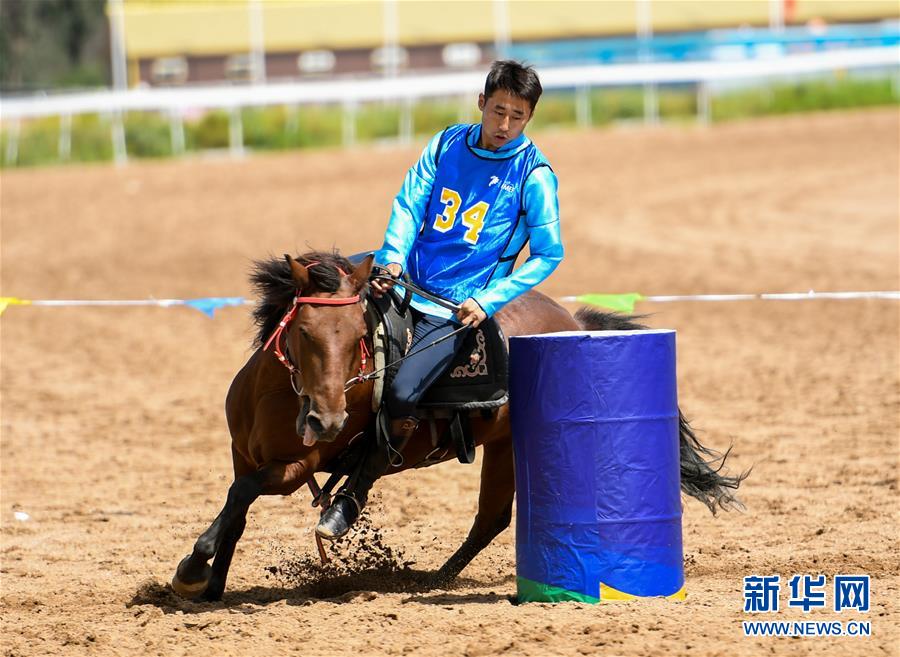 8月20日,騎手在“蒙古馬”傳統技巧表演中展示騎馬繞桶。 新華社記者 彭源 攝