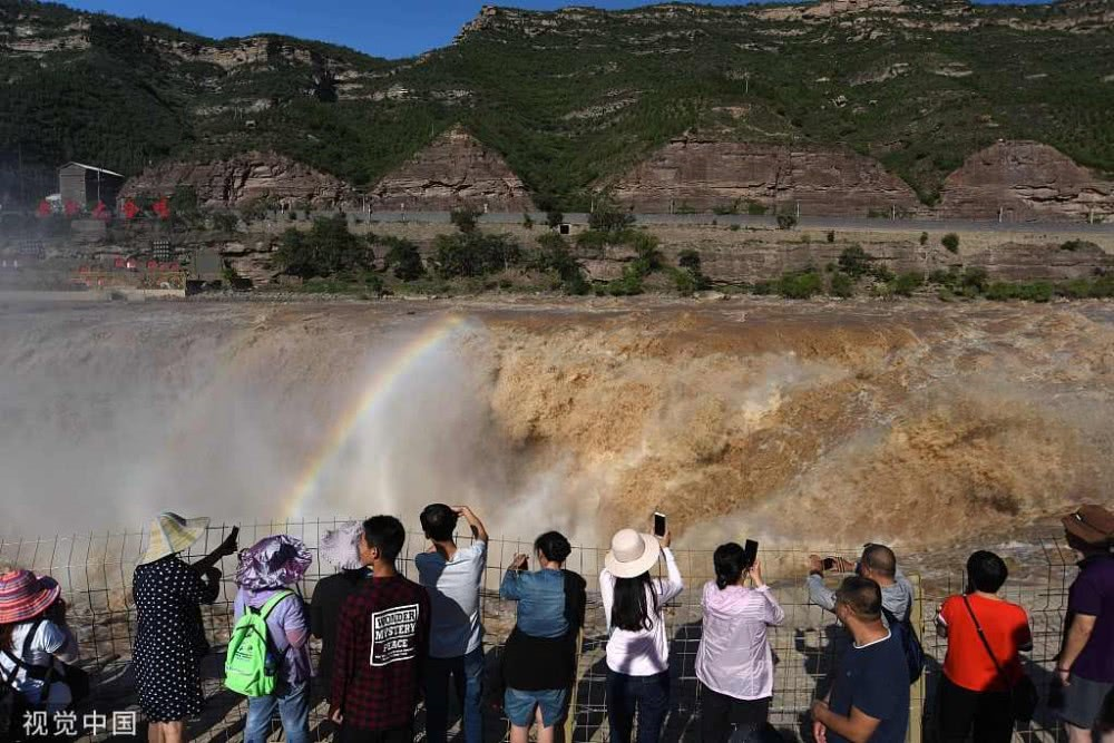 2019年8月17日,山西臨汾,游客在吉縣黃河壺口瀑布欣賞“彩虹門(mén)”景觀(guān)。
