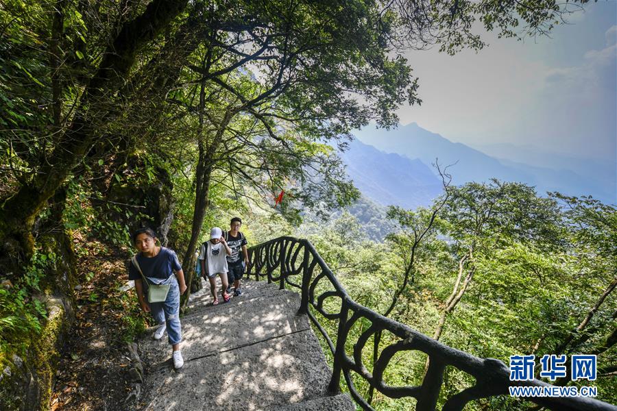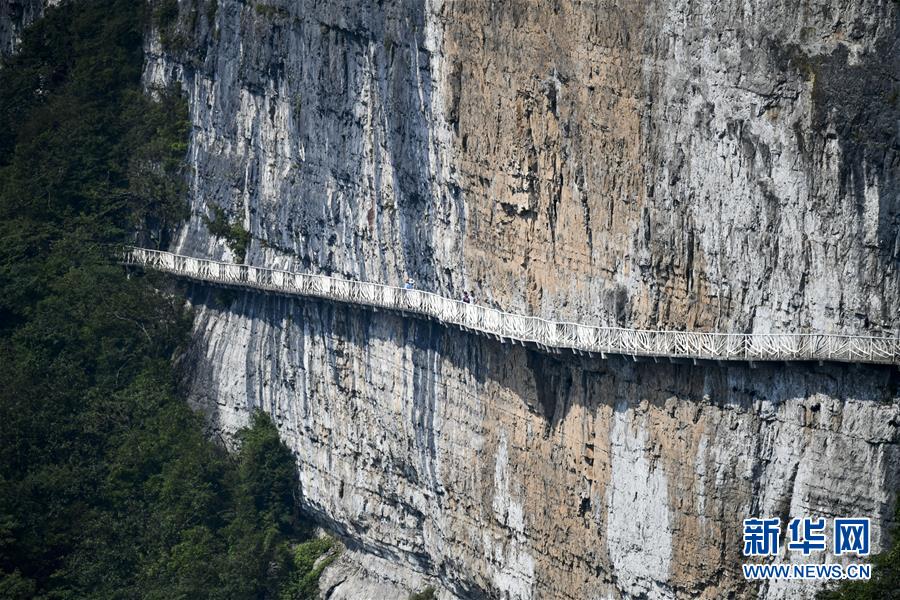 游客在重慶金佛山風景區(qū)內的絕壁棧道上游覽體驗(8月20日攝)。 新華社記者 劉潺 攝