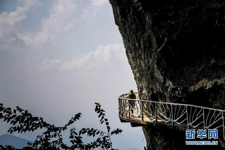 游客在重慶金佛山風景區(qū)內的絕壁棧道上游覽體驗(8月20日攝)。 新華社記者 劉潺 攝