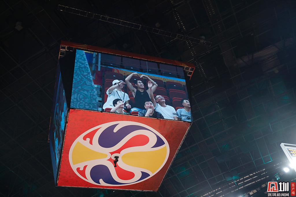球館上空屏幕中,一位觀眾對著鏡頭做起“比心”的手勢。